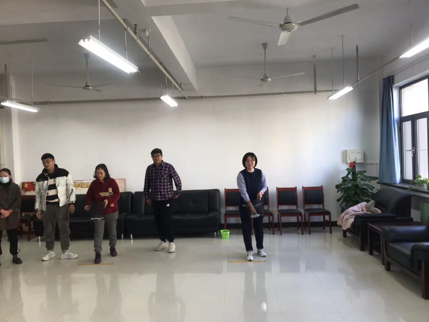 本次活动方式为投掷人员站在投掷线后,向四米外的目标物(洗脸盆)投掷乒乓球,可以直接投向目标物,也可以投向地面经多次弹跳奔向目标物,每人十个球,以最后留在目标物内的乒乓球数作为最终成绩。