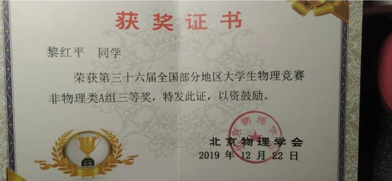 曾获国家励志奖学金、全国大学生物理竞赛三等奖、校级优秀团干部等荣誉。