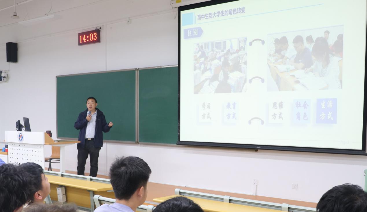 肖峰首先从学习方法、教育方式、思维方式、社会角色、生活方式等方面指出高中生到大学生的角色转变。他希望同学们有坚实宽广的基础理念、系统深入的专业知识、独立思考的创新能力,要锻炼自己的主观能动性,成为一个合格的时间管理者,做出高中生到大学生的完美蜕变。
