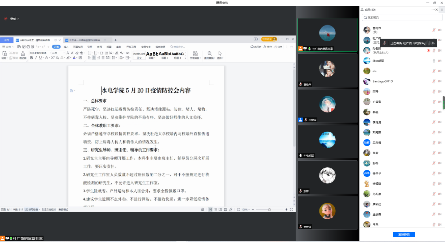 学院党委副书记杜广微向全体教职工传达上级有关部门对疫情防控工作的要求和学校疫情防控调度会议的情况。号召全院教职工必须遵守学校疫情防控要求,坚决扛起疫情防控责任,杜绝大学校墙内与校墙外直接传递物资,防止病毒人传人和物传人的情况发生,堵住源头,防住、堵人、堵物,不带病毒入校。要求研究生导师、本科生班主任、辅导员要压实责任:一是对不按规定进行核酸检测的研究生,禁止进入研究生工作室,严格执行学生佩戴口罩要求;二是导师要给课题组学生做思想工作,疏导学生近期不点外卖、不进行网购、不接收快递,进一步降低疫情传播风险;三是特殊时期,要关心关爱我们的学生,要关注他们的生活、心理和学业,确保学院不出安全稳定事故。四是通报了学校近期因违反疫情防控要求,学生受到校纪处分的情况。